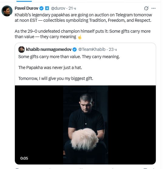 “Легендарные папахи Хабиба будут выставлены на аукцион в Telegram — коллекционные предметы, символизирующие Традиции, Свободу и Уважение. Как говорит сам непобежденный чемпион с результатом 29-0: “Некоторые подарки не просто ценны — они несут в себе смысл”, — написал Павел Дуров в соцсети Х.