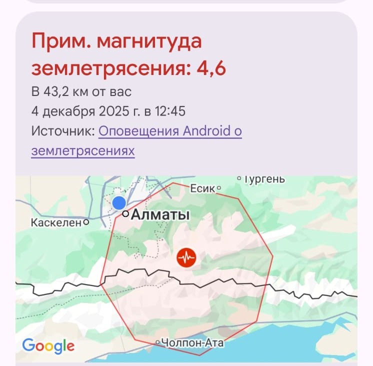“Cетью сейсмических станций ТОО “ННЦСНИ” МЧС РК 04 декабря 2025 г. в 12 : 44 по времени г. Астаны зарегистрировано землетрясение. Эпицентр расположен в 277 км. на юго-восток от г. Алматы на территории Китая .