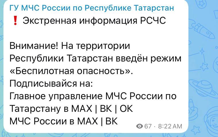Напомним, вчера на территории республики также вводился режим беспилотной опасности. Аэропорты Нижнекамска, Бугульмы и Казани временно приостанавливали приём и выпуск воздушных судов.