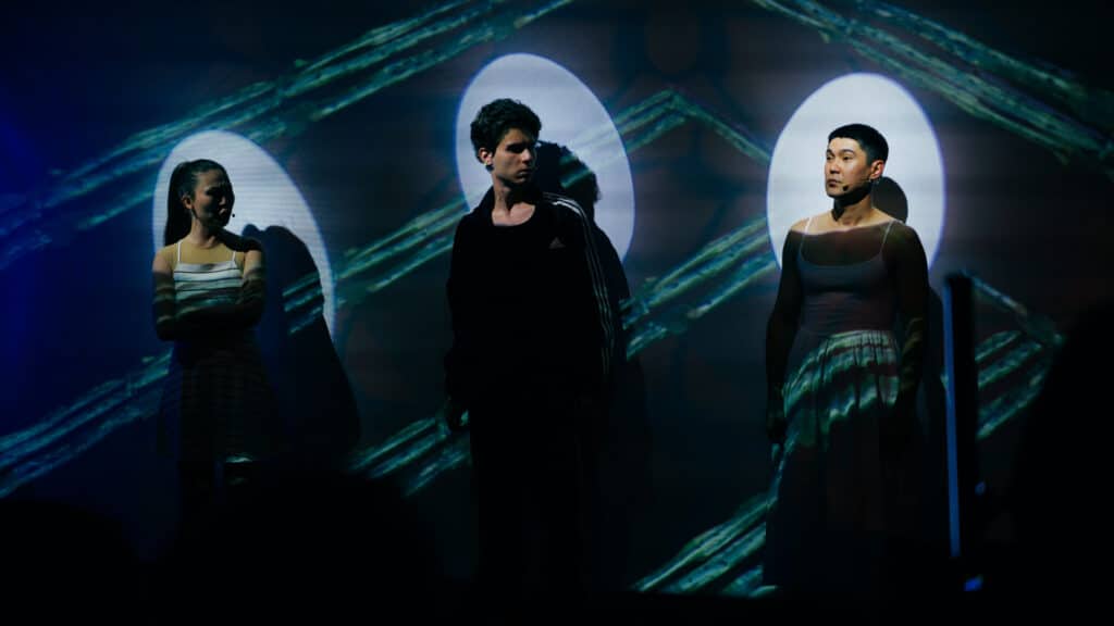 Экран играет не меньшую роль, чем актёры. Зрители наблюдают за настоящим потоком сознания в пикселях: футажи из Left 4 Dead, всплывающие уведомления из Grindr, переписки, мемы, видео из TikTok и — внезапно — берлинский Берхайн, воссозданный в Minecraft. Экран становится отражением внутреннего мира героя.