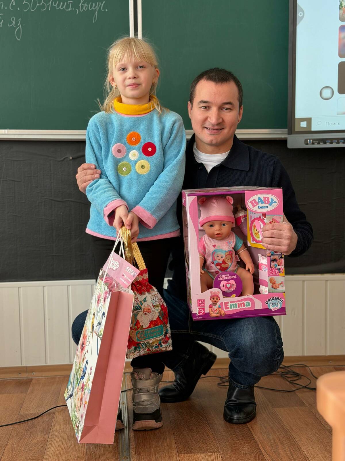 В Лисичанске вице-премьер РТ посетил одну из городских школ, где встретился с восьмилетней Дианой. Девочка написала в письме, что мечтает о кукле с коляской. Садыков лично вручил подарок – вместе со сладкими наборами для девочки и её одноклассников.