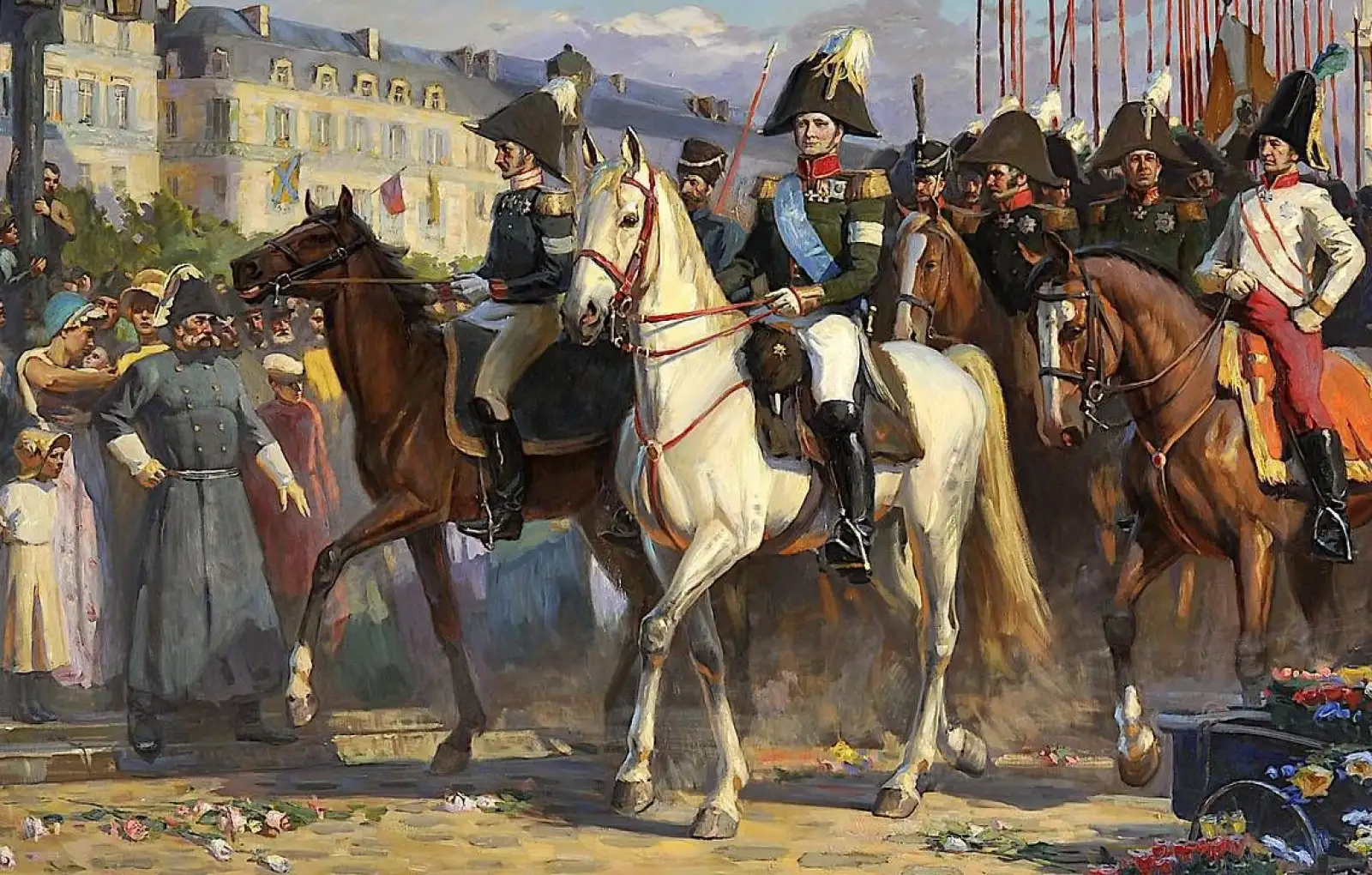 Уже 31 марта 1814 года союзные войска во главе с Александром I торжественно вошли в Париж. Их встречали радостные французы, уставшие от наполеоновской деспотии. Под ноги императору Александру I бросали букеты цветов, русских офицеров бесплатно поили и кормили в парижских кафе.