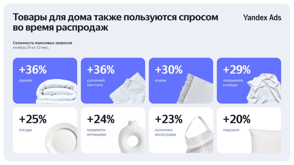 В период распродаж пользователи активнее покупают товары онлайн и увеличивают траты на них. Самый большой прирост в категориях одежда, обувь и аксессуары — на 112% растут онлайн-продажи и на 137% — доходы интернет-магазинов. На втором месте товары для дома: количество продаж в ноябре увеличивается на 86%, доход — на 69%. Влияние интернет-рекламы на покупки в распродажи растёт кратно: магазины получают от продвижения в среднем в три раза больше продаж.