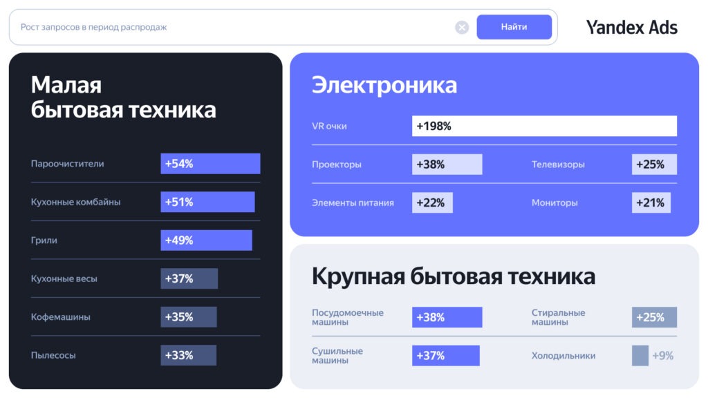 Во время распродаж стремительно растёт количество запросов про электронику — пользователи ищут скидки на товары, которые давно планируют купить. Увеличивается интерес не только к смартфонам, планшетам и сопутствующим устройствам, но и к VR-очкам — в три раза по сравнению со средними значениями в году. Пользователи Яндекс Поиска на 54% активнее проявляют интерес к пароочистителям, на 51% к кухонным комбайнам, на 49% к грилям. Среди крупной бытовой техники растёт спрос на посудомоечные и сушильные машины — на 38% и 37% соответственно.
