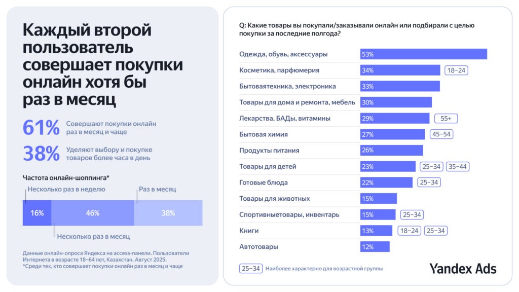 Исследование учитывает данные Yandex Qazaqstan по поисковым запросам и активности пользователей в сервисах электронной коммерции и геосервисх в 2023-2025 годах, результаты онлайн-опроса среди 1306 жителей Республики Казахстан в возрасте 18-64 лет в августе 2025 года, а также внутренние агрегированные обезличенные данные.