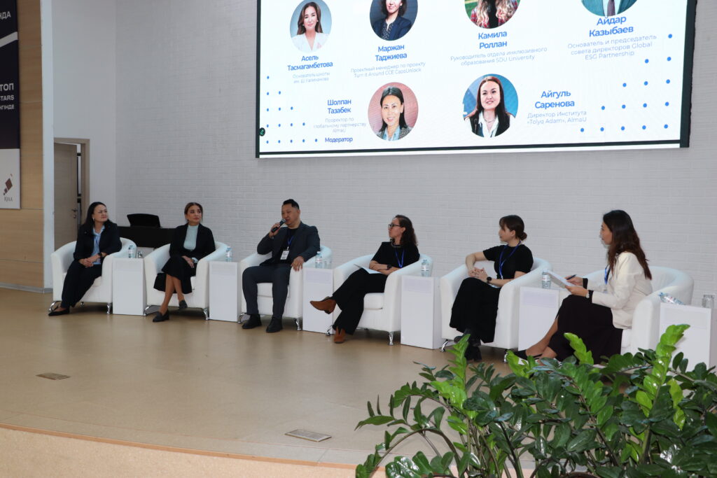 Асель Тасмагамбетова-Основатель школы им. Ш.Уалиханова; Айгуль Саренова- Директор Института «Tolyq Adam»; Камила Роллан- PhD, Руководитель отдела инклюзивного образования SDU; Айдар Казыбаев – Основатель и председатель совета директоров Global ESG Partnership; Маржан Таджиева – проектный мненеджер Turn It Around CCE CapsUnlock.
