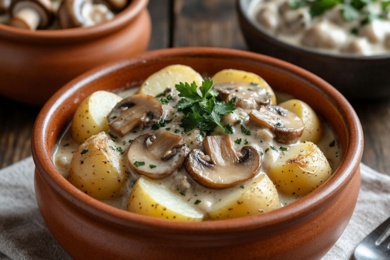 Получается обалденная вкуснятина: нежная, тающая картошка, пропитанная сливочно-грибным соусом с лёгкой кислинкой, и ароматные шампиньоны в сметанной глазури.
